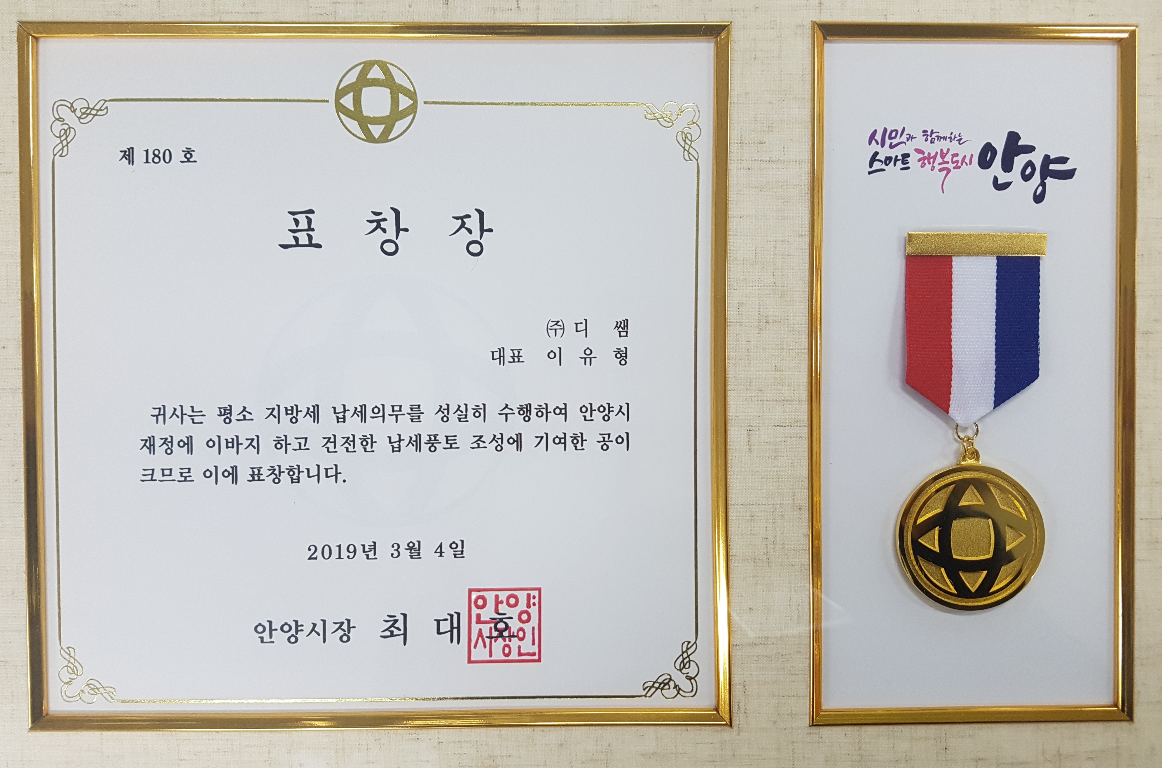 In recognition of our contribution to the finance of Anyang City and the development of a sound tax climate,
