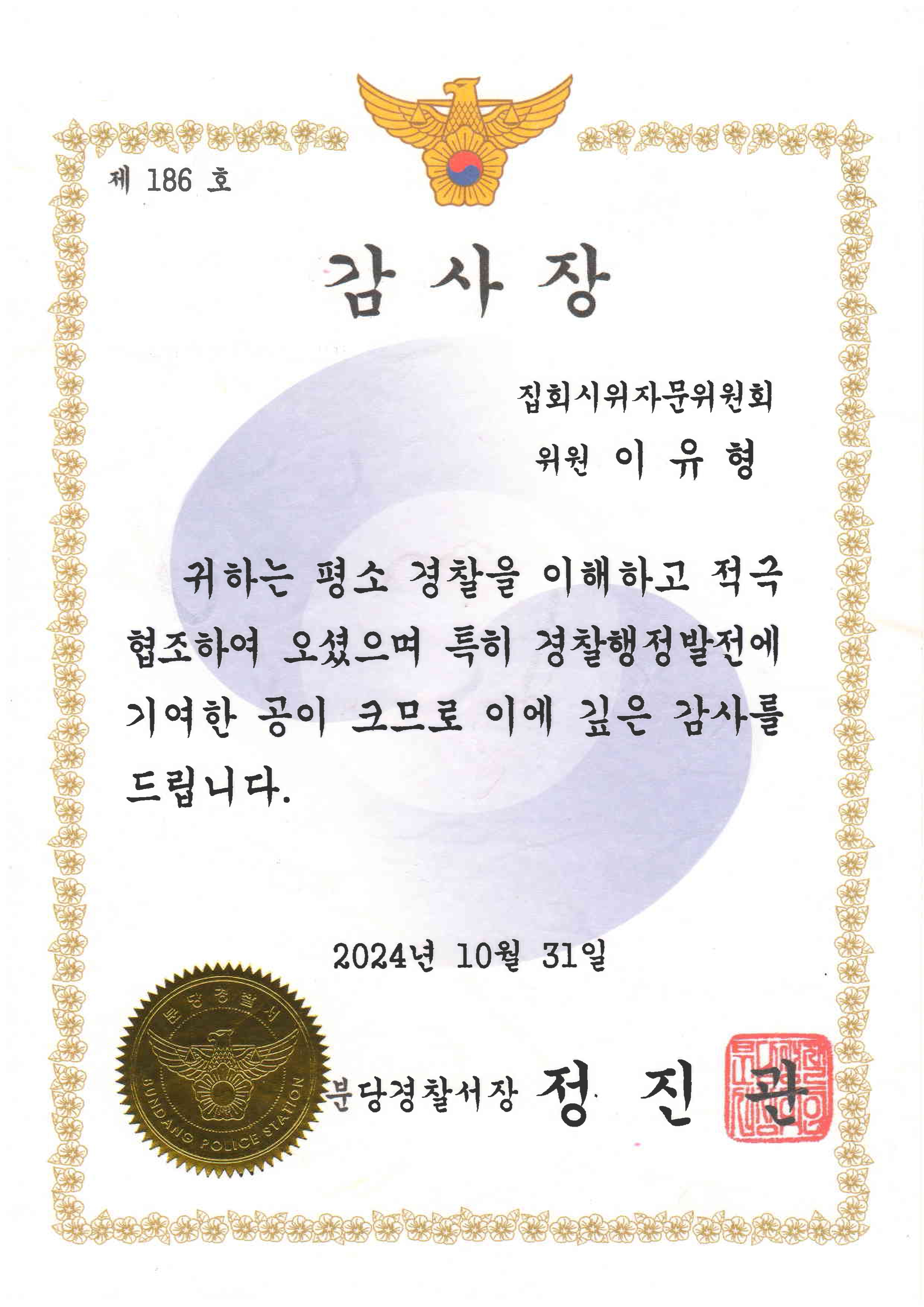 I received a letter of appreciation from 'Bundang Police Chief'.