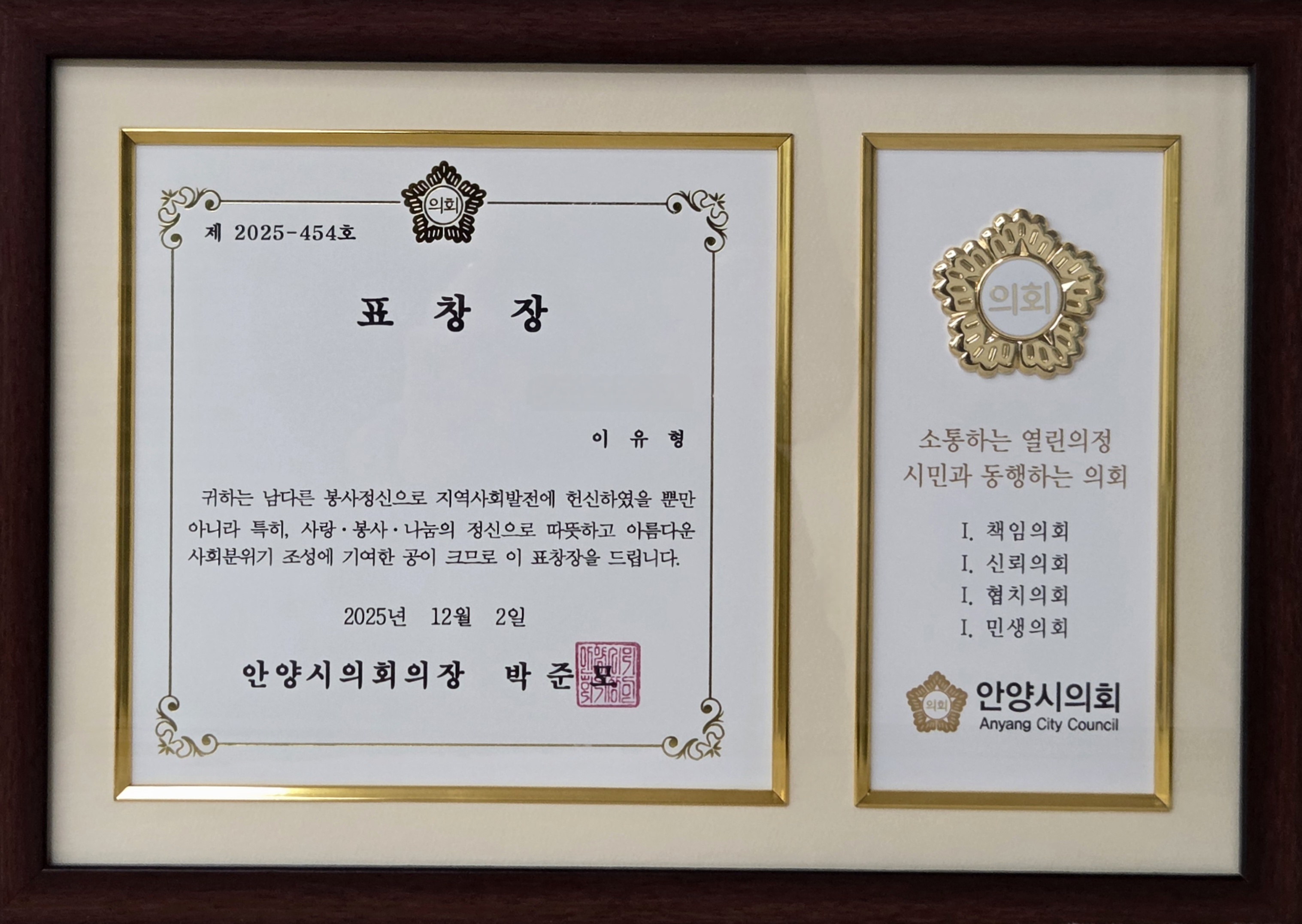 '안양시의회'로부터 표창장을 수상하였습니다.